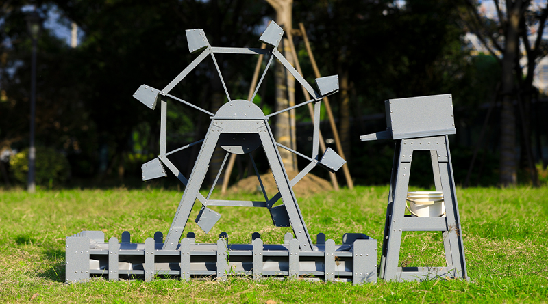 材质:塑料板,亚克力 这款产品属于户外大型科学玩具,在探索操作的过程中,可认识水车的组件、水车转动的机械能原理,感知力学原理,同时促进手臂大肌肉的发育,以及合作、探究、观察记录等科探能力的发展。