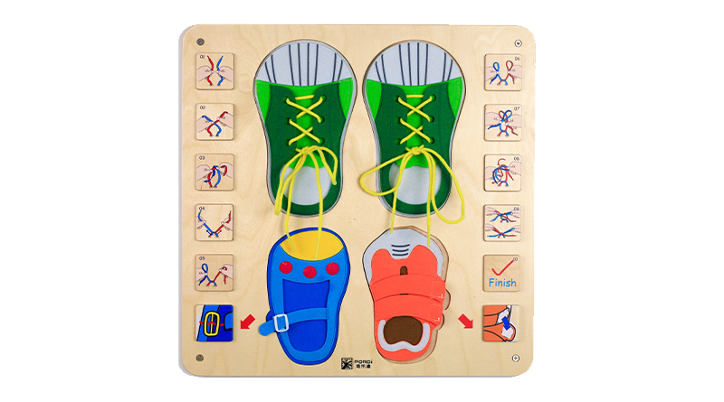这款产品属于生活自理能力教育产品。玩具立体丰富,适合2-6岁儿童使用。托幼班的儿童需要在教师或家长的引导下,学会看图示,根据图示模仿不同鞋子的系法。中大班儿童可以自己观察步骤图示,根据图示的指引,学会系鞋带。不同年龄段的儿童通过有规律的绕线、穿扣眼、魔术贴粘贴等技能训练,熟练地掌握鞋子的系法。在这个过程中,儿童的手眼协调能力、手指的灵活性、专注力、对比观察能力等得到了发展,同时,儿童通过系鞋带,仔细地认识了两只鞋的异同,初步形成了“左右”的概念,强化了儿童鞋子不能“穿反”的意识,进而拓展了儿童穿裤子、扣扣子等的生活自理能力。该产品也可以作为幼儿园生活自理能力教育的教具使用,可投放在娃娃家等角色区,或集体教学活动中使用。