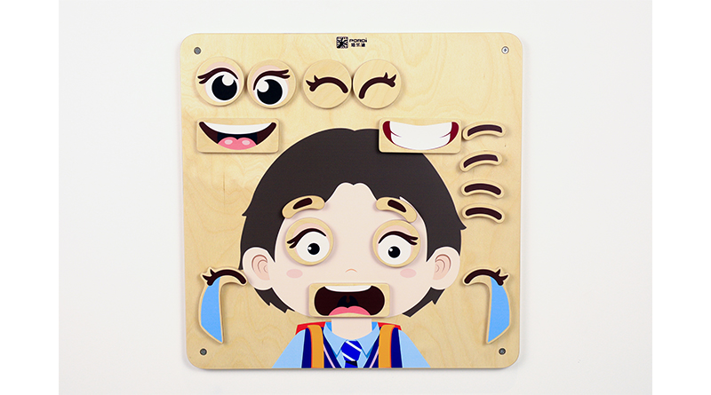 这款产品属于表情认知与管理的教育产品。学习板上有不同的眼睛、眉毛、嘴巴。2-6岁儿童通过摆放操作,组合出人的面孔。通过不同部位的组合,呈现出不同的面部表情,不同年龄的儿童在组合的过程中,对自己与他人的面部表情有了较深的认识。进而思考情绪与表情之间的微妙关系,促使儿童自我管理不良情绪,展现积极情绪。在操作的过程中,也促进了儿童手部精细肌肉的发育能力,以及空间方位能力的发展。