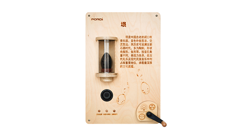 本产品的结构合理、紧凑,通过乐器件模拟实物乐器,让孩子直观观察乐器形状结构,相比于平面化的介绍更有感知度,输入按钮作为输入端通过控制电路板控制扬声器播放乐器相关知识内容,满足孩子针对想要了解的乐器自主的控制输入按钮并从扬声器听到对应内容,掌握相关乐器知识,教学介绍效果好,适于推广