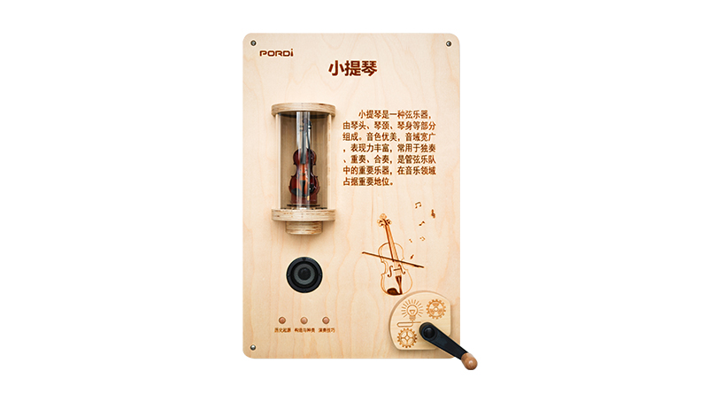 本产品的结构合理、紧凑,通过乐器件模拟实物乐器,让孩子直观观察乐器形状结构,相比于平面化的介绍更有感知度,输入按钮作为输入端通过控制电路板控制扬声器播放乐器相关知识内容,满足孩子针对想要了解的乐器自主的控制输入按钮并从扬声器听到对应内容,掌握相关乐器知识,教学介绍效果好,适于推广