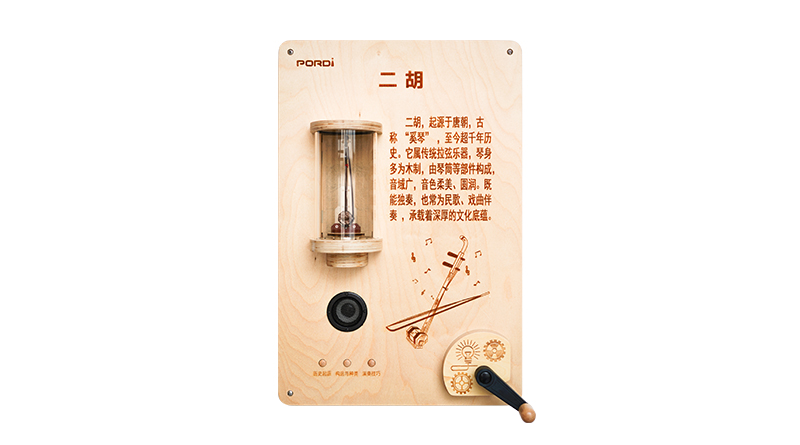 本产品的结构合理、紧凑,通过乐器件模拟实物乐器,让孩子直观观察乐器形状结构,相比于平面化的介绍更有感知度,输入按钮作为输入端通过控制电路板控制扬声器播放乐器相关知识内容,满足孩子针对想要了解的乐器自主的控制输入按钮并从扬声器听到对应内容,掌握相关乐器知识,教学介绍效果好,适于推广
