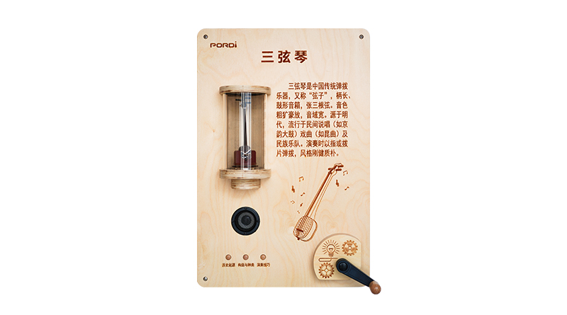 本产品的结构合理、紧凑,通过乐器件模拟实物乐器,让孩子直观观察乐器形状结构,相比于平面化的介绍更有感知度,输入按钮作为输入端通过控制电路板控制扬声器播放乐器相关知识内容,满足孩子针对想要了解的乐器自主的控制输入按钮并从扬声器听到对应内容,掌握相关乐器知识,教学介绍效果好,适于推广