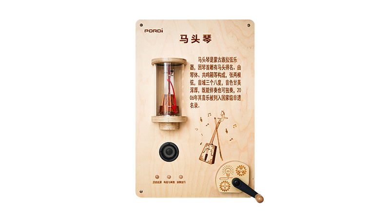 本产品的结构合理、紧凑,通过乐器件模拟实物乐器,让孩子直观观察乐器形状结构,相比于平面化的介绍更有感知度,输入按钮作为输入端通过控制电路板控制扬声器播放乐器相关知识内容,满足孩子针对想要了解的乐器自主的控制输入按钮并从扬声器听到对应内容,掌握相关乐器知识,教学介绍效果好,适于推广