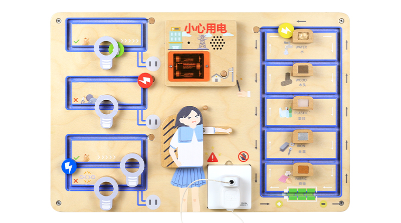 材质:进口桦木夹板,环保水性漆;无毒,无味,产品质量通过中国强制性产品GB6675认证,通过ISO9001,2015国际质量体系认证,达到出口欧美标准。通过该款玩具可以使小朋友更加的了解电的好处以及坏处
