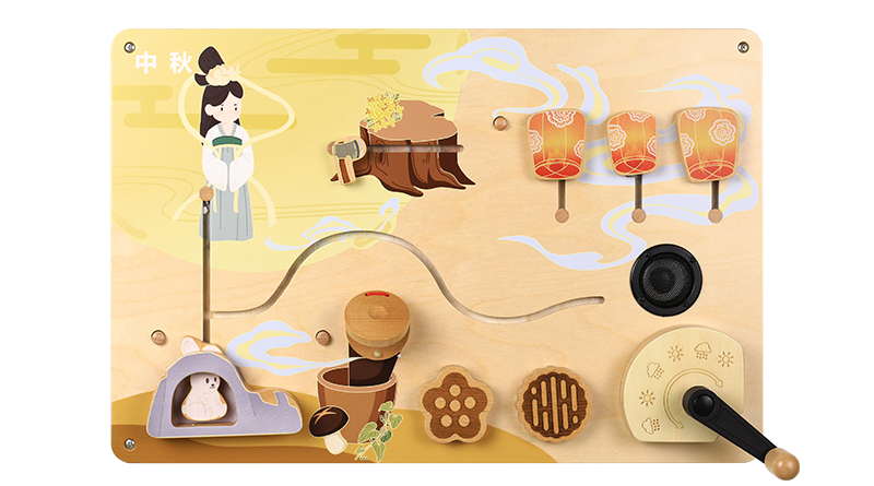材质:进口桦木夹板,环保水性漆;无毒,无味,产品质量通过中国强制性产品GB6675认证,通过ISO9001,2015国际质量体系认证,达到出口欧美标准。该款玩具通过手摇发电,触摸对应的按键,语音解说传统节日中秋节的风俗习惯