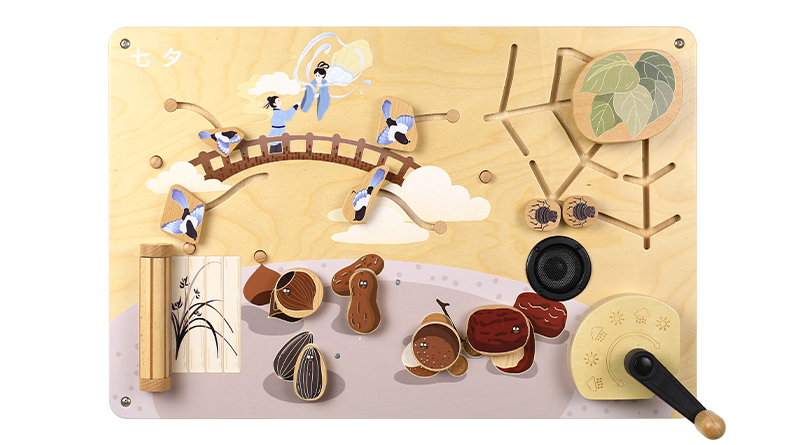 材质:进口桦木夹板,环保水性漆;无毒,无味,产品质量通过中国强制性产品GB6675认证,通过ISO9001,2015国际质量体系认证,达到出口欧美标准。该款玩具通过手摇发电,触摸对应的按键,语音解说传统节日七夕节的风俗习惯