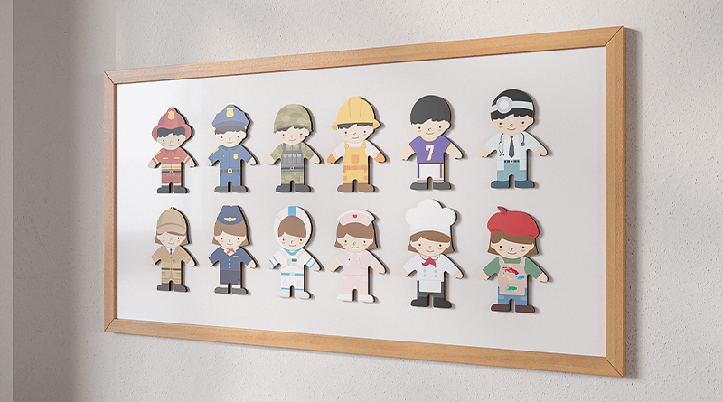 积木片,材质:椴木夹板,软磁,配置:提示卡1张,提示卡尺寸11.9*8.9cm,配置:由头部,身体,腿部3片积木组成的职业人物,15.1*10.5*0.5cm的消防员1个,14*10.5*0.5cm的医生1个,14.6*10.5*0.5cm的警察1个,14.1*10.5*0.5cm的特种兵1个,14.8*10.5*0.5cm的环卫工人1个,14*10.5*0.5cm的运动员1个,14.4*10.5*0.5cm护士1个,15*10.5*0.5cm的画家1个,14.7*10.5*0.5cm的宇航员1个,14.8*10.5*0.5cm的海军1个,15.9*10.5*0.5cm的烘培师1个,14.2*10.5*0.5cm的军官1个,共计12个职业人物,由36片积木组成。