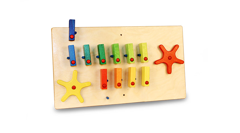 从多米诺系列(一)“快乐的脚步”延伸“你追我赶”多米诺系列(二) ,接着以螺旋式的教具设计,鹰架幼儿的游戏能力,且提供经验的改变与新增,原系列(一)、(二)都是以红色骨牌为第一个骨牌。在(三)“说话的星星”就改换为蓝色为第一个骨牌,当蓝色骨牌被推倒后产生了「雪球运动」物理运动现象,而「雪球运动」即是触动一个事件,然后引发接二连三的事件发生,事件之间互为因果,“说话的星星”就是利用因果关系的游戏原理,当深蓝色的骨牌移动后,牵引蓝色的骨牌倒向蓝绿色、绿色、浅绿色、黄绿色、红色的五角星齿轮、浅黄色、黄色、深黄色、橙色、红色,一直到最后一块红色的骨牌倒下后,触动跟系列(一)(二)一样的黄色五角星齿轮,特别的是在婴幼儿原熟悉的视觉效果产生些微不同的变化,在旧经验上产生新的经验,达到满足预期的黄色五角星齿轮的转动外,还增加红色的五角星齿轮的转动,并且安排在中间,让之前五角星齿轮转动就是最后一个结果,产生了当触及到不同颜色(即橙色)五角星齿轮后,骨牌还继续产生「雪球效应」,这创造出双重因果玩具的游戏心理效果,增强感觉期婴幼儿的因果游戏经验,增进婴幼儿心理发展的特征与敏感期过程的认知层次。